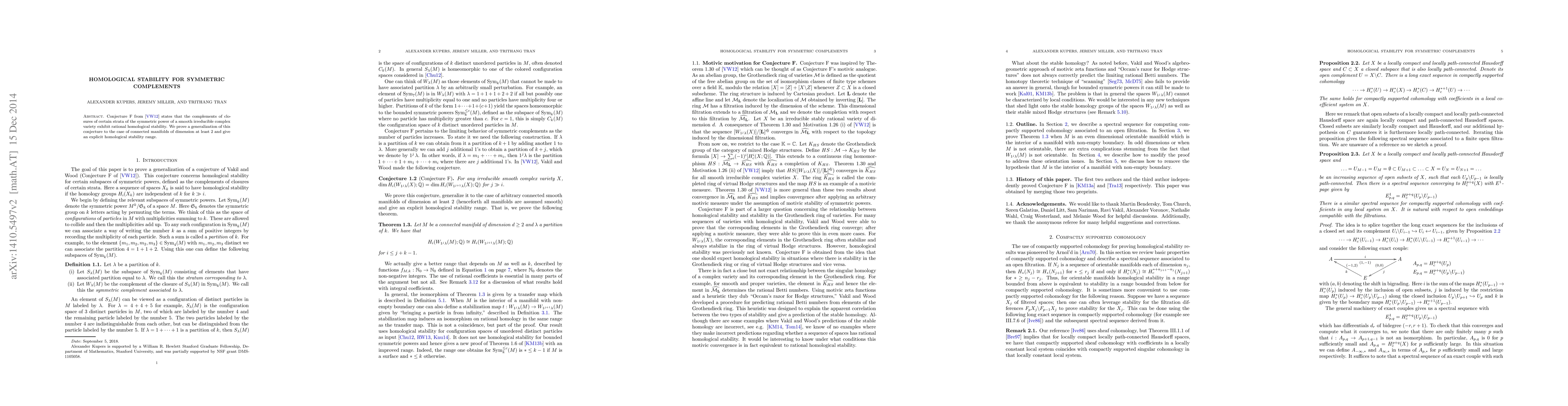 Conjecture F from [VW12] states that the complements of closures of certain strata of the symmetric power of a smooth irreducible complex variety exhibit rational homological stability. We prove a generalization of this conjecture to the case of connected manifolds of dimension at least 2 and give an explicit homological stability range.