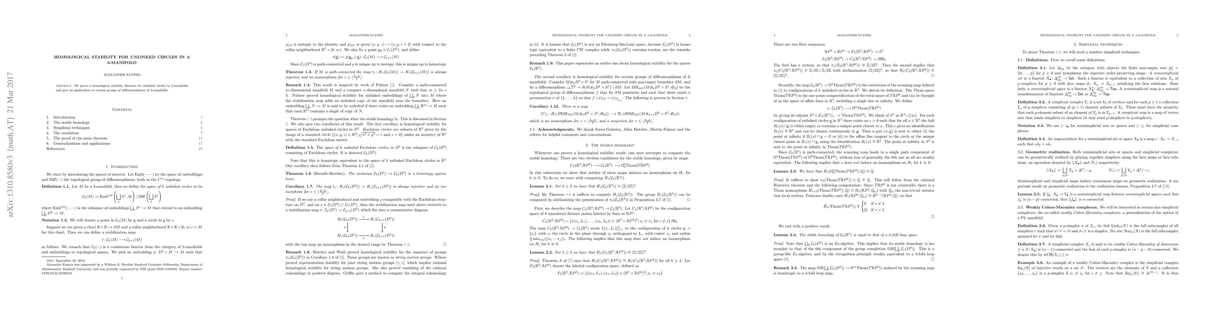Summary: This paper establishes a homological stability result for unlinked circles within 3-manifolds, and demonstrates its application to the study of specific diffeomorphism groups acting on these manifolds.
