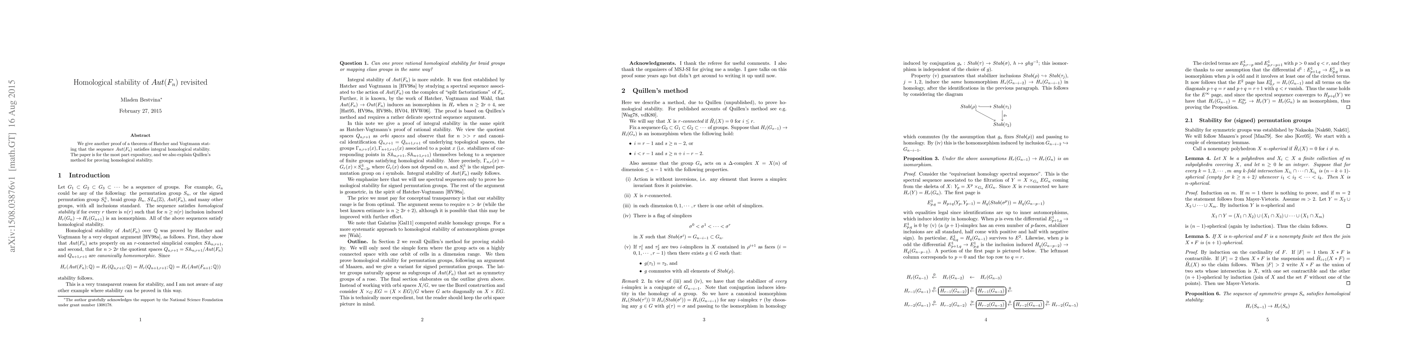 We give another proof of a theorem of Hatcher and Vogtmann stating that the sequence $Aut(F_n)$ satisfies integral homological stability. The paper is for the most part expository, and we also explain Quillen's method for proving homological stability.