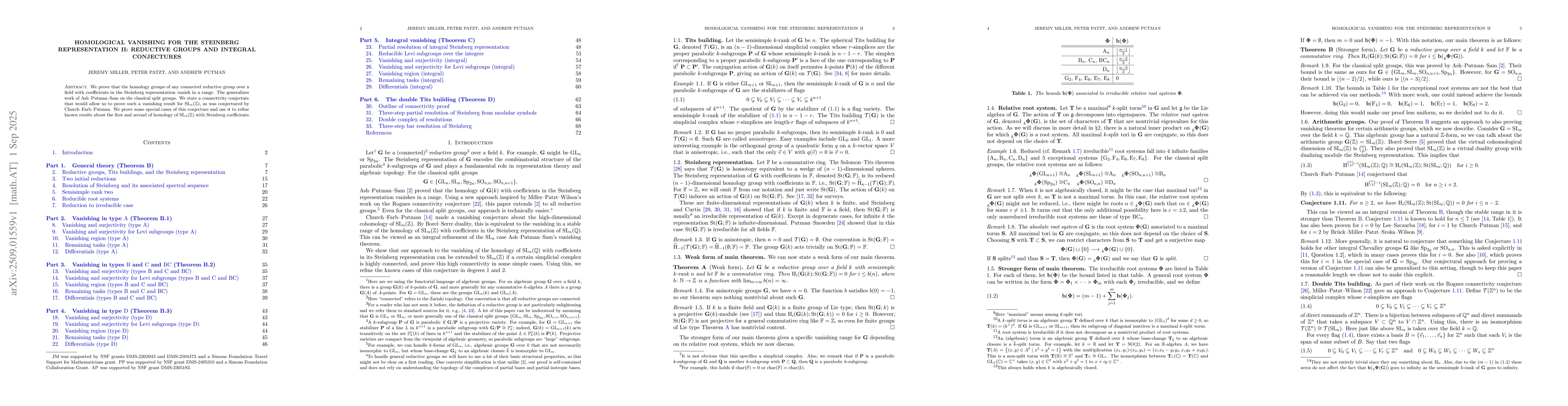 We prove that the homology groups of any connected reductive group over a field with coefficients in the Steinberg representation vanish in a range. The generalizes work of Ash-Putman-Sam on the classical split groups. We state a connectivity conjecture that would allow us to prove such a vanishing result for $SL_n(\mathbb{Z})$, as was conjectured by Church-Farb-Putman. We prove some special cases of this conjecture and use it to refine known results about the first and second of homology of $SL_n(\mathbb{Z})$ with Steinberg coefficients.