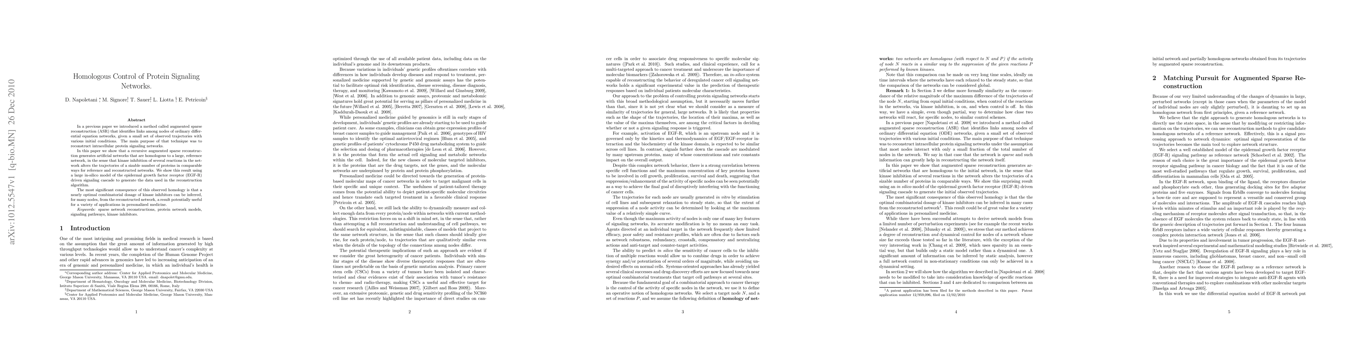 In a previous paper we introduced a method called augmented sparse reconstruction (ASR) that identifies links among nodes of ordinary differential equation networks, given a small set of observed trajectories with various initial conditions. The main purpose of that technique was to reconstruct intracellular protein signaling networks. In this paper we show that a recursive augmented sparse reconstruction generates artificial networks that are homologous to a large, reference network, in the sense that kinase inhibition of several reactions in the network alters the trajectories of a sizable number of proteins in comparable ways for reference and reconstructed networks. We show this result using a large in-silico model of the epidermal growth factor receptor (EGF-R) driven signaling cascade to generate the data used in the reconstruction algorithm. The most significant consequence of this observed homology is that a nearly optimal combinatorial dosage of kinase inhibitors can be inferred, for many nodes, from the reconstructed network, a result potentially useful for a variety of applications in personalized medicine.