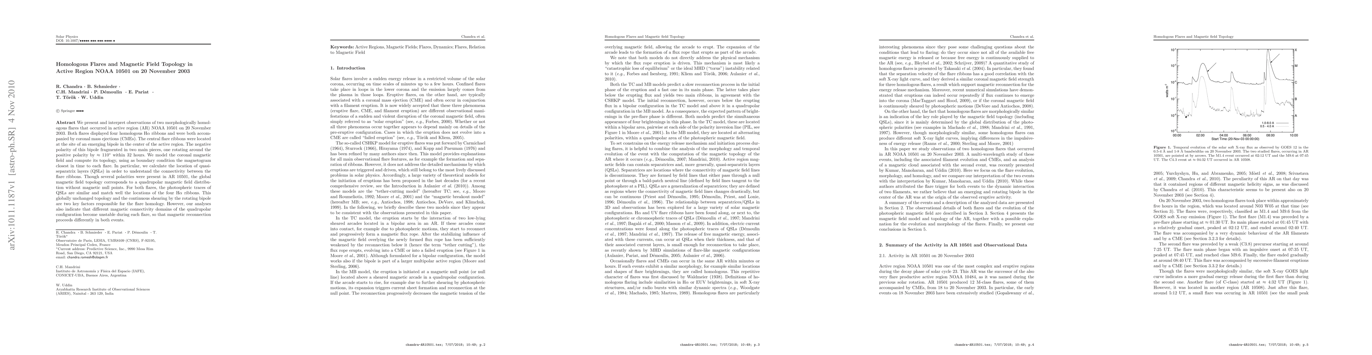 This paper examines two homologous flares in active region NOAA 10501, finding they share four H-alpha ribbons and are accompanied by coronal mass ejections. The study models the coronal magnetic field and identifies quasiseparatrix layers to explain the ribbon connectivity, revealing a quadrupolar field topology without null points that remains consistent despite differing reconnection processes in each flare.