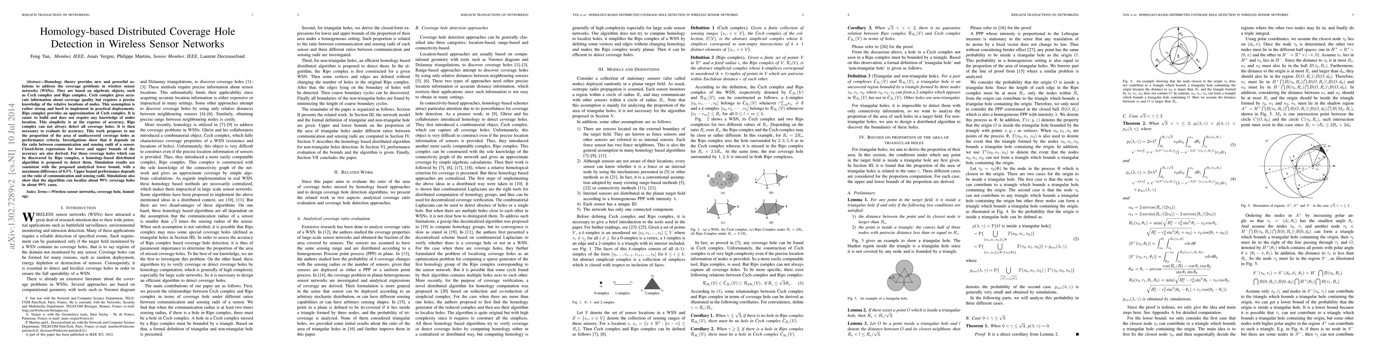 This paper proposes a homology-based distributed method for detecting coverage holes in wireless sensor networks using Rips complex, which simplifies the detection process without requiring precise node locations. The study derives analytical bounds for accuracy and demonstrates that the algorithm can localize nearly all detectable coverage holes with high accuracy.