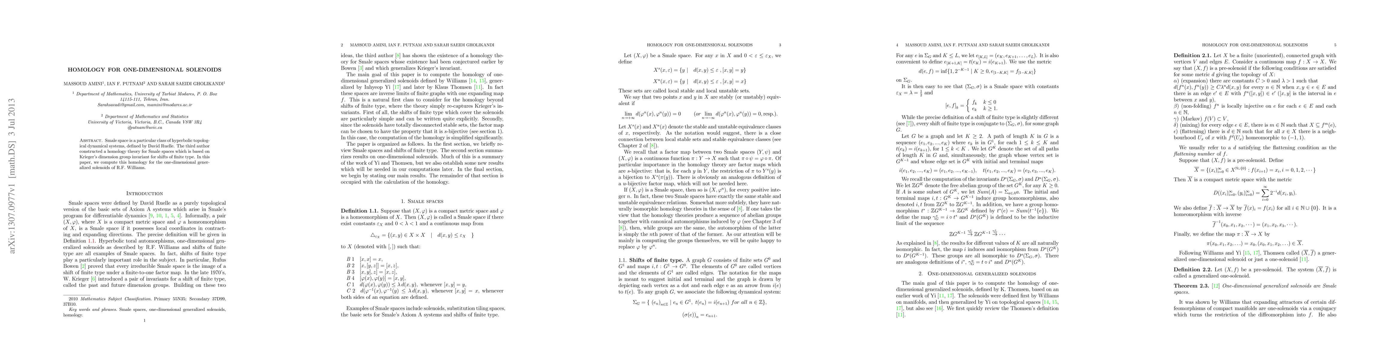 This paper computes a homology theory for one-dimensional generalized solenoids, extending the work on Smale spaces by constructing a homology based on Krieger's dimension group invariant for shifts of finite type. The focus is on the specific case of one-dimensional solenoids as defined by R.F. Williams.