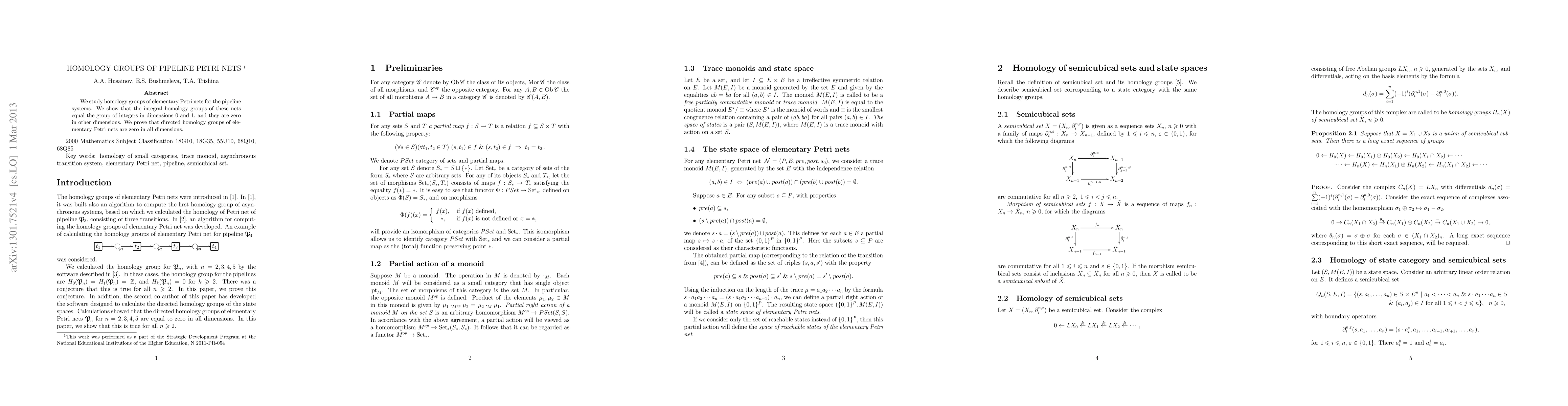 We study homology groups of elementary Petri nets for the pipeline systems. We show that the integral homology groups of these nets in dimensions 0 and 1 equal the group of integers, and they are zero in other dimensions. We prove that directed homology groups of elementary Petri nets are zero in all dimensions.