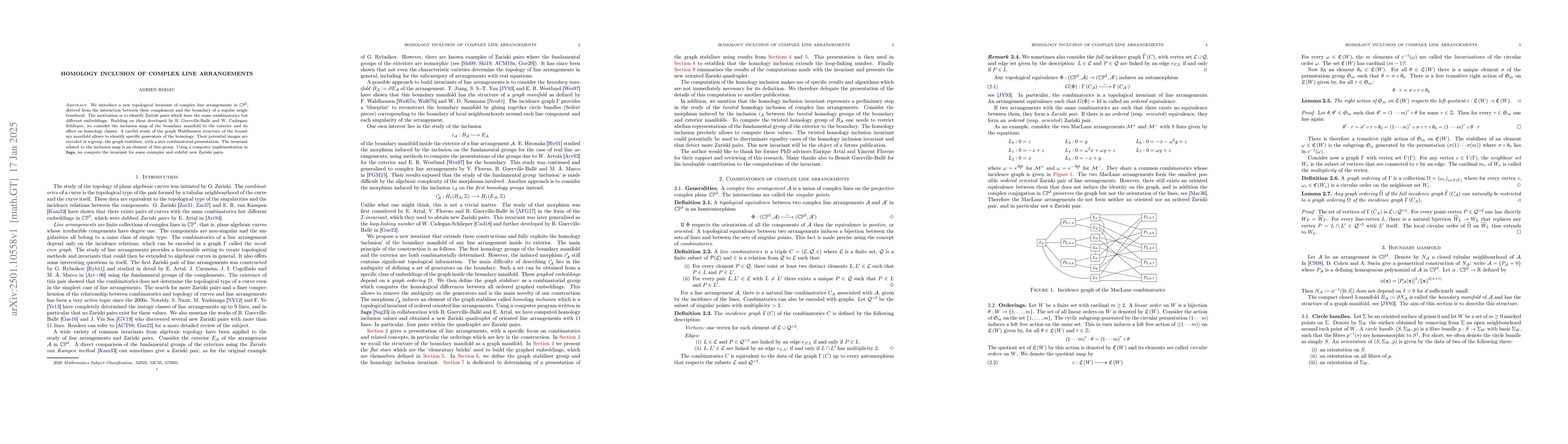 This paper introduces a new topological invariant for complex line arrangements in $\mathbb{CP}^2$, based on the homology inclusion of their boundary and complement. The invariant aims to distinguish Zariski pairs with identical combinatorial properties but different embeddings, computed via a computer program in Sage.
