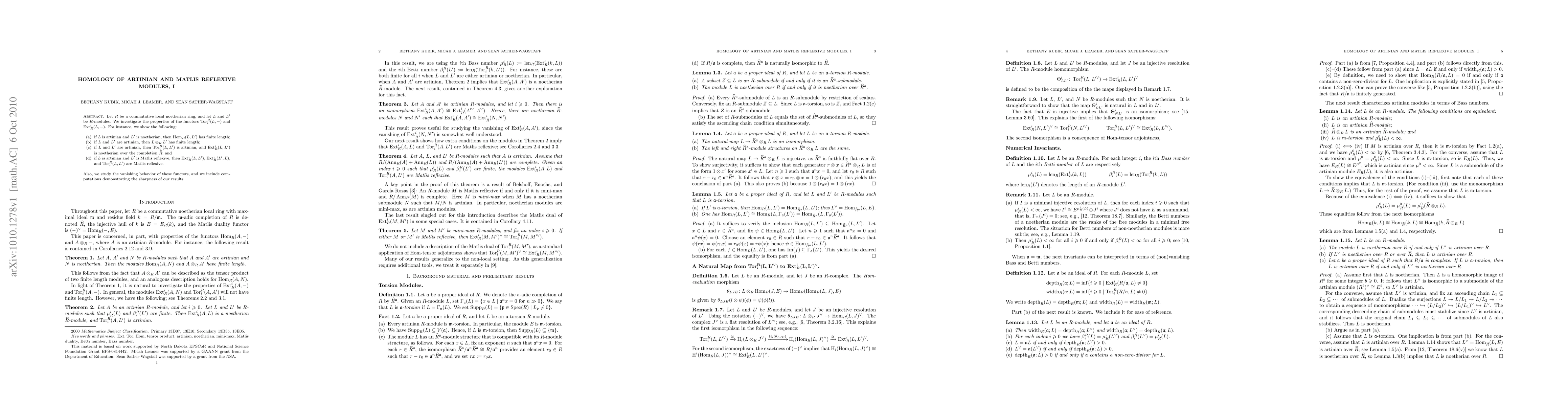 This paper explores the homology properties of artinian and Matlis reflexive modules over a commutative local Noetherian ring R, focusing on functors Tor and Ext. Key findings include finite length results for Hom, tensor products, and Tor/Ext when dealing with artinian and Matlis reflexive modules, along with computations that highlight the precision of the results.