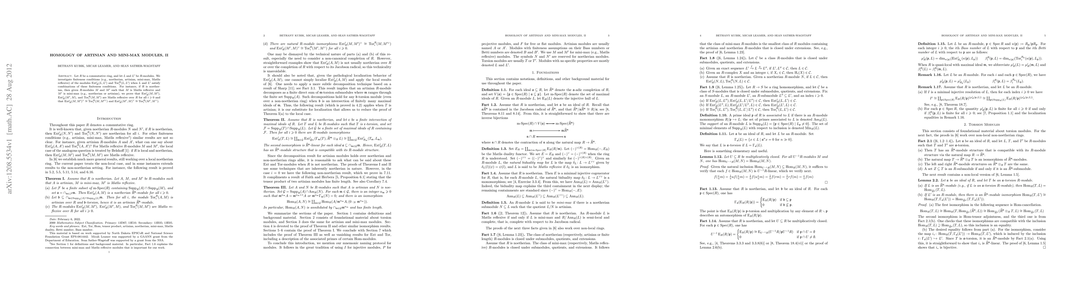 This paper explores the homology properties (Ext and Tor) of R-modules L and L' under various finiteness conditions, including noetherian, artinian, and mini-max. It proves that when R is noetherian, Ext and Tor between a Matlis reflexive module and a mini-max module are Matlis reflexive and establishes isomorphisms between certain duals of Ext and Tor.