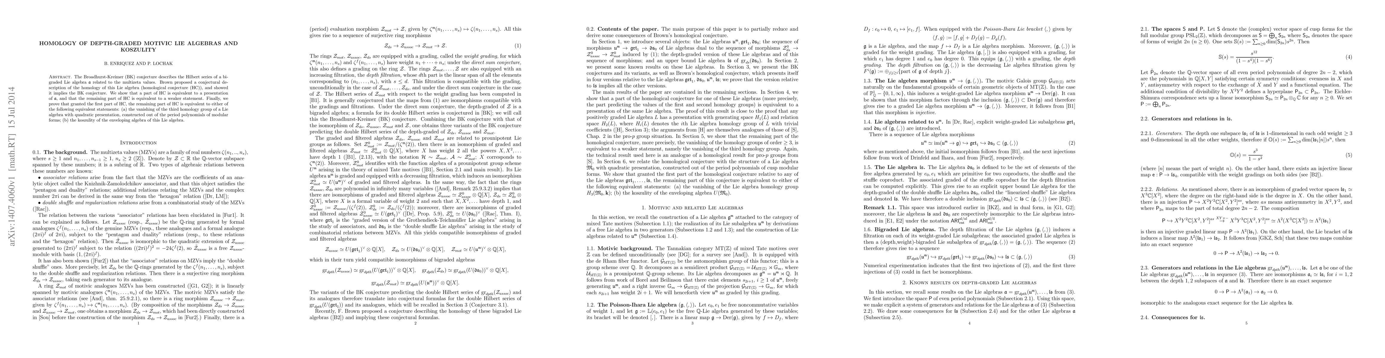 This paper investigates the Broadhurst-Kreimer conjecture related to multizeta values, proving a part of Brown's homological conjecture. It establishes equivalences between parts of this conjecture, the Hilbert series, and the homology of a Lie algebra. The findings link the conjecture to the koszulity of the enveloping algebra of this Lie algebra, offering insights into algebraic structures of motivic Lie algebras.
