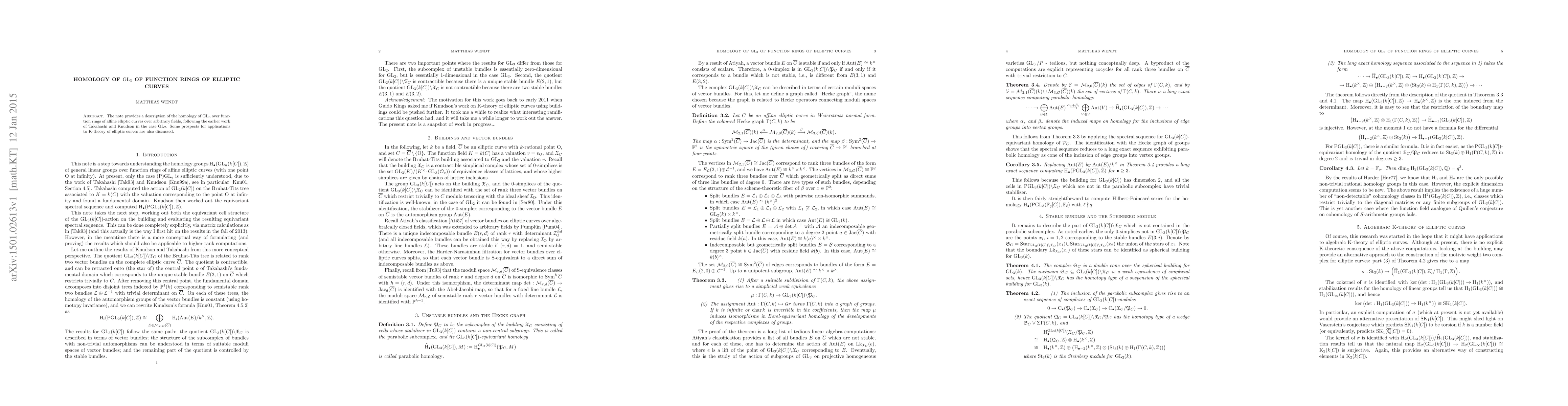 The note provides a description of the homology of $GL_3$ over function rings of affine elliptic curves over arbitrary fields, following the earlier work of Takahashi and Knudson in the case $GL_2$. Some prospects for applications to K-theory of elliptic curves are also discussed.