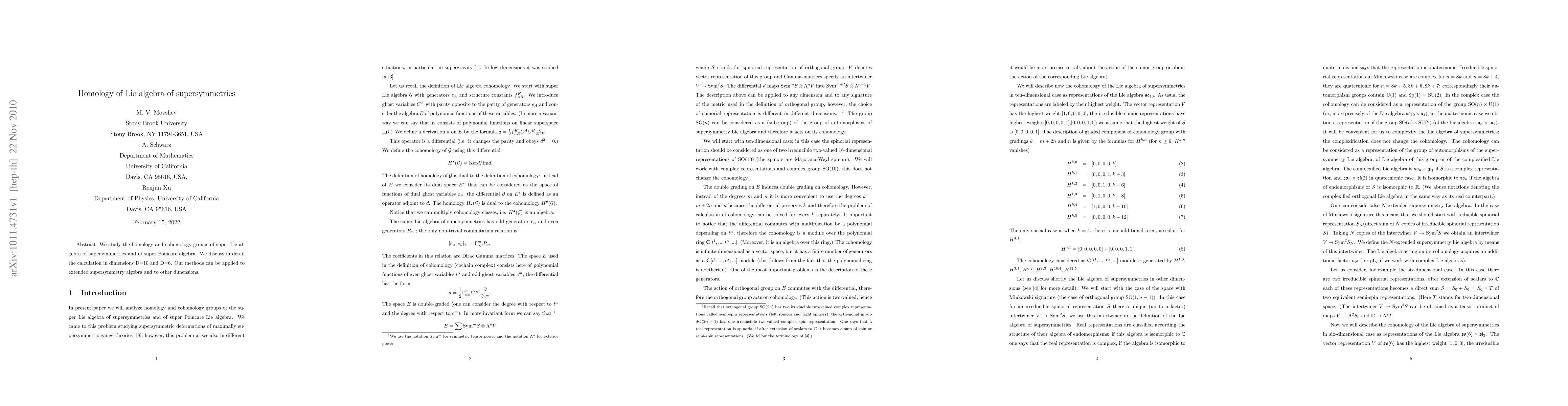 This paper investigates the homology and cohomology groups of the super Lie algebra of supersymmetries and the super Poincaré algebra, focusing on dimensions D=10 and D=6. The methods developed are applicable to extended supersymmetry algebra and other dimensions.