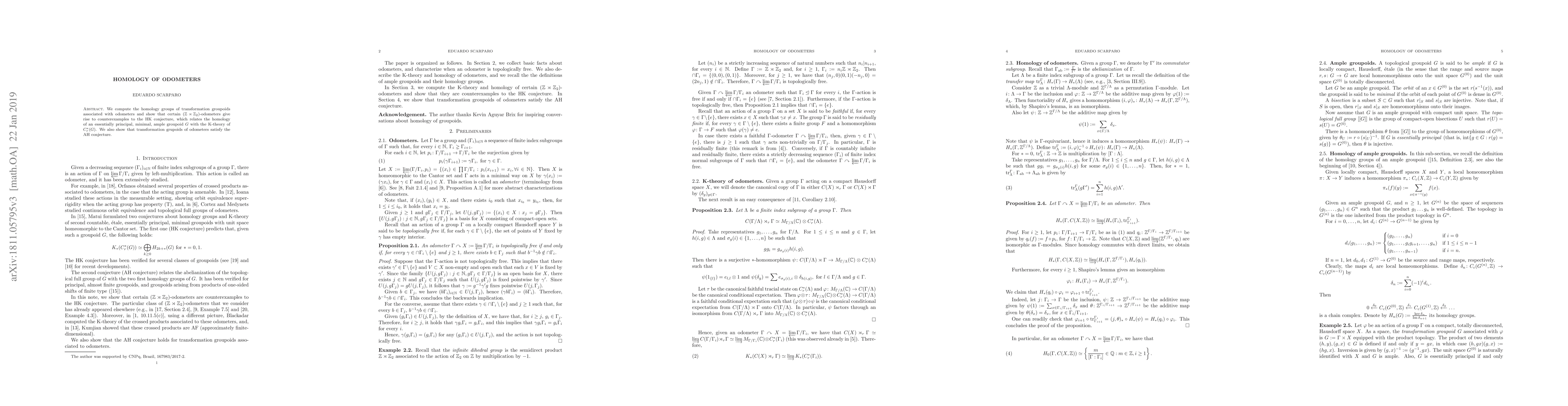 This paper computes the homology groups of transformation groupoids linked to odometers and demonstrates that certain infinite dihedral group odometers disprove the HK conjecture. It also proves that transformation groupoids of odometers satisfy the AH conjecture.
