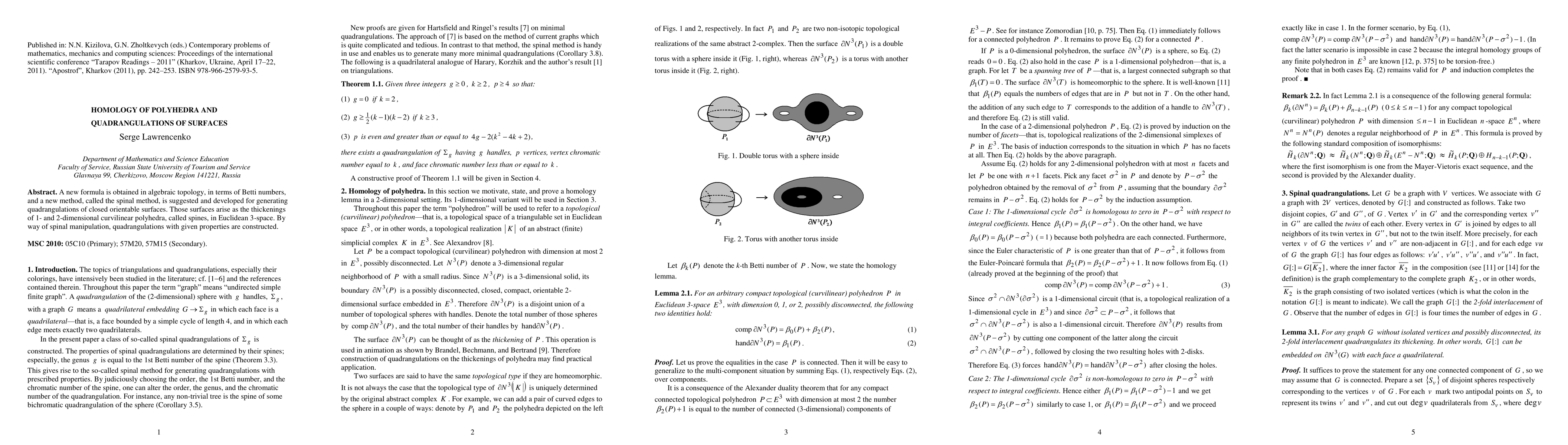 This paper introduces a novel formula in algebraic topology using Betti numbers and develops the spinal method for generating quadrangulations of closed orientable surfaces, which arise from the thickenings of curvilinear polyhedra in 3D space. The method allows for the construction of quadrangulations with specified properties.