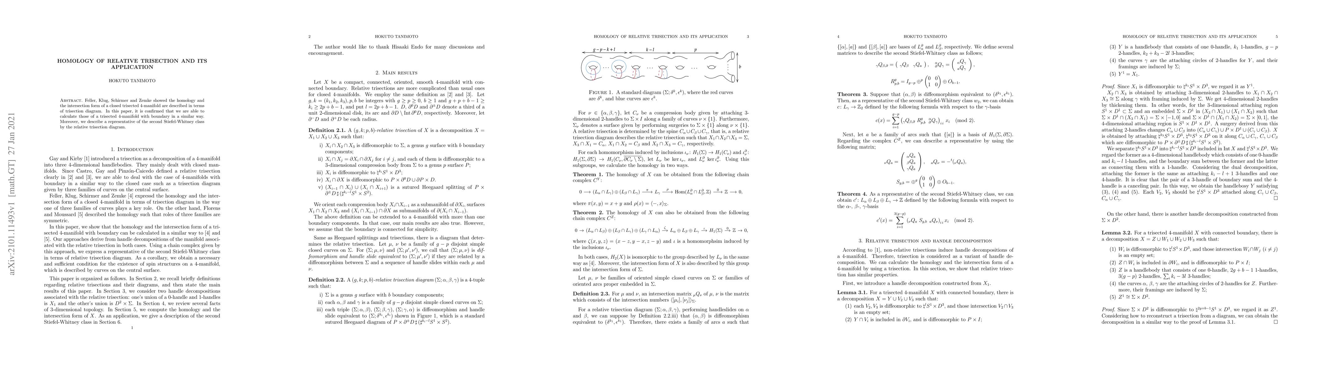 This paper confirms the calculation of homology and intersection forms for trisected 4-manifolds with boundary, similar to previous work by Feller et al. It also describes a representative of the second Stiefel-Whitney class using relative trisection diagrams.
