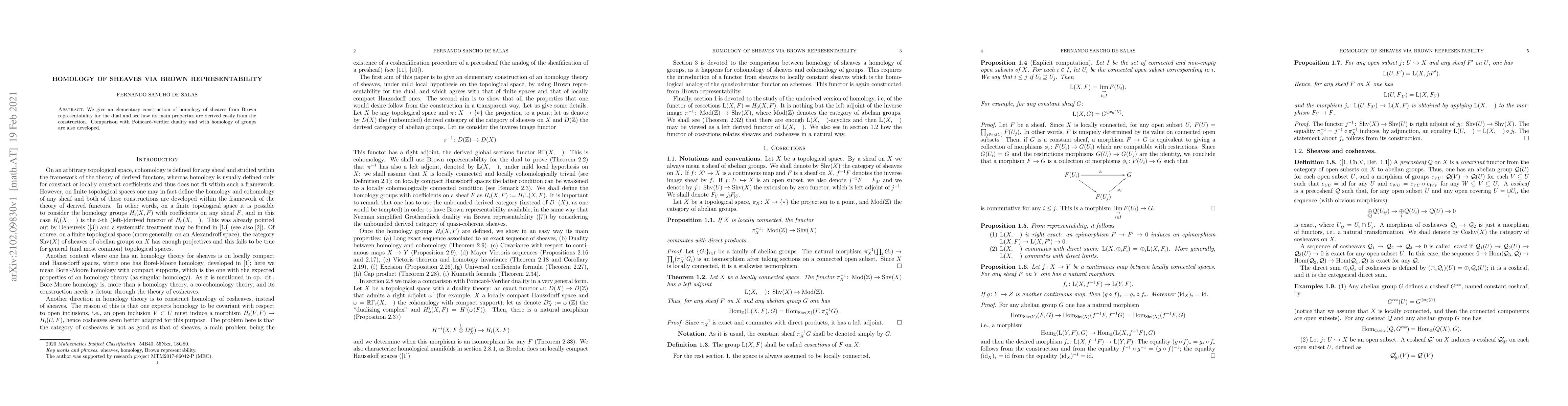 This paper constructs homology of sheaves using Brown representability, demonstrating its properties through the construction and comparing it with Poincaré-Verdier duality and homology of groups. The approach provides an elementary yet comprehensive method for understanding sheaf homology.