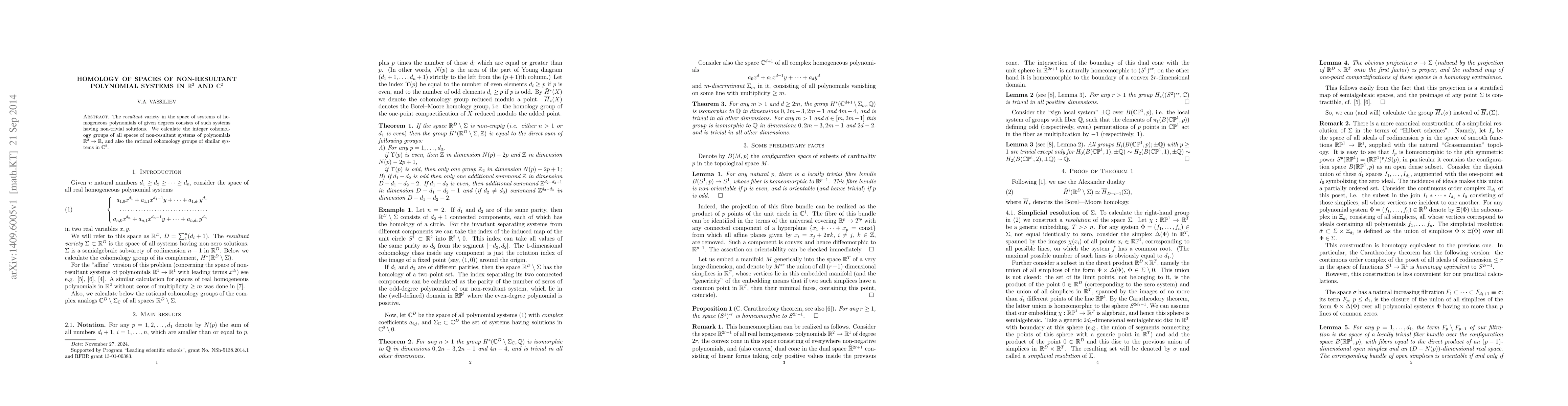 The resultant veriety in the space of systems of homogeneous polynomials of given degrees consists of such systems having non-trivial solutions. We calculate the integer cohomology groups of all spaces of non-resultant systems of polynomials $R^2 \to R$, and also the rational cohomology groups of similar systems in $C^2$.