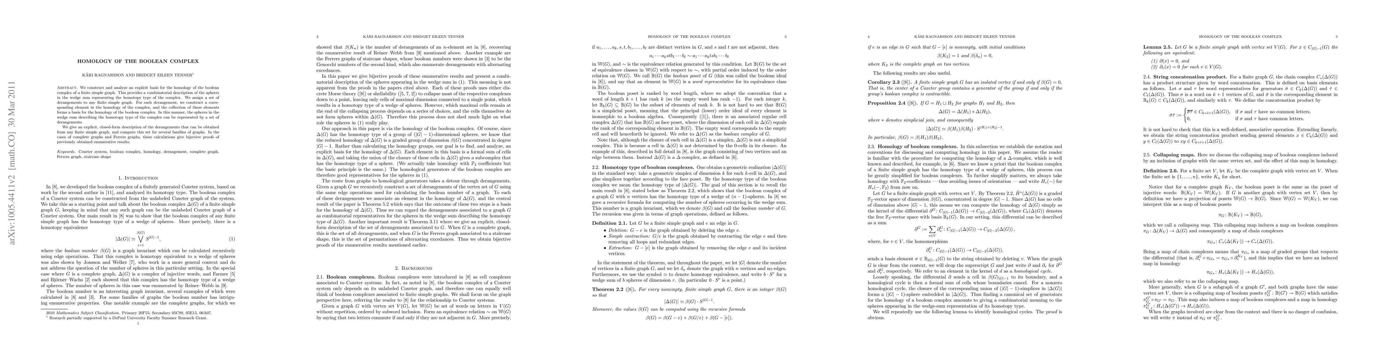 We construct and analyze an explicit basis for the homology of the boolean complex of a Coxeter system. This gives combinatorial meaning to the spheres in the wedge sum describing the homotopy type of the complex. We assign a set of derangements to any finite simple graph. For each derangement, we construct a corresponding element in the homology of the complex, and the collection of these elements forms a basis for the homology of the boolean complex. In this manner, the spheres in the wedge sum describing the homotopy type of the complex can be represented by a set of derangements. We give an explicit, closed-form description of the derangements that can be obtained from any graph, and compute this set for several families of graphs. In the cases of complete graphs and Ferrers graphs, these calculations give bijective proofs of previously obtained enumerative results.