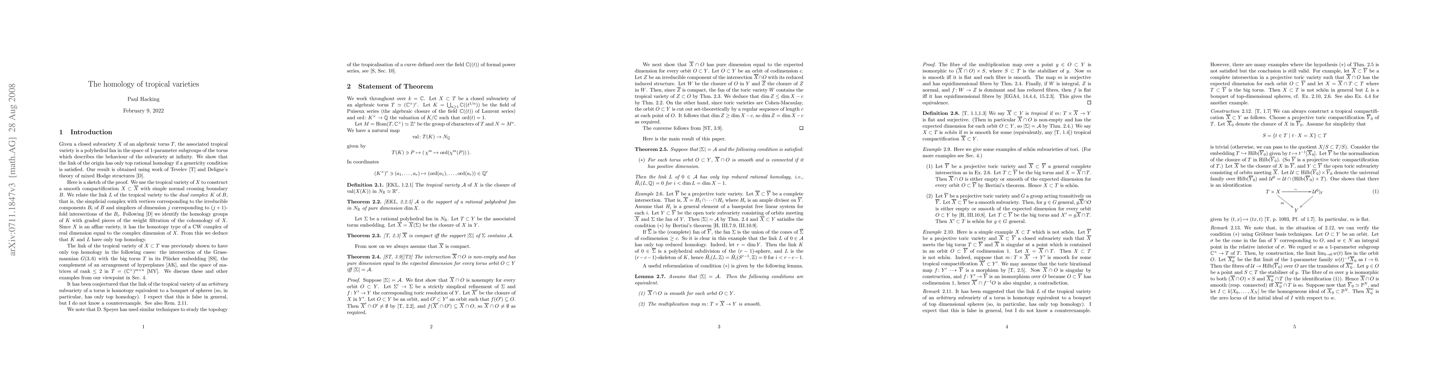 This paper studies the homology of tropical varieties associated with closed subvarieties of an algebraic torus. It demonstrates that the link of the origin in the tropical variety has only top rational homology under a specific genericity condition, leveraging Tevelev's work and Deligne's theory of mixed Hodge structures.