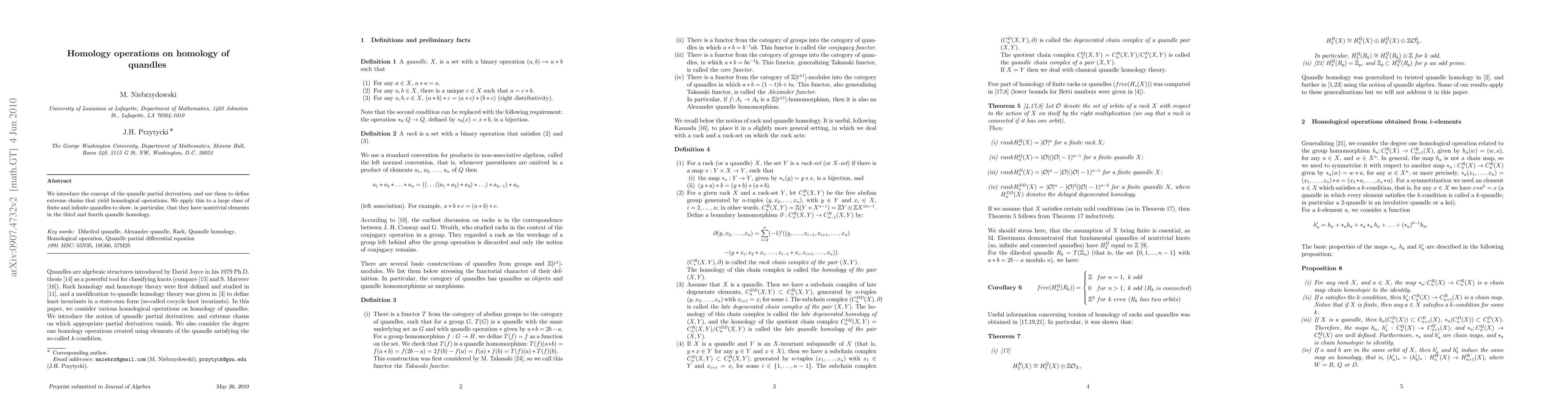 This paper explores homological operations on quandle homology, introducing quandle partial derivatives and extreme chains where these derivatives vanish. It also examines degree one homology operations using quandle elements that meet the $k$-condition.