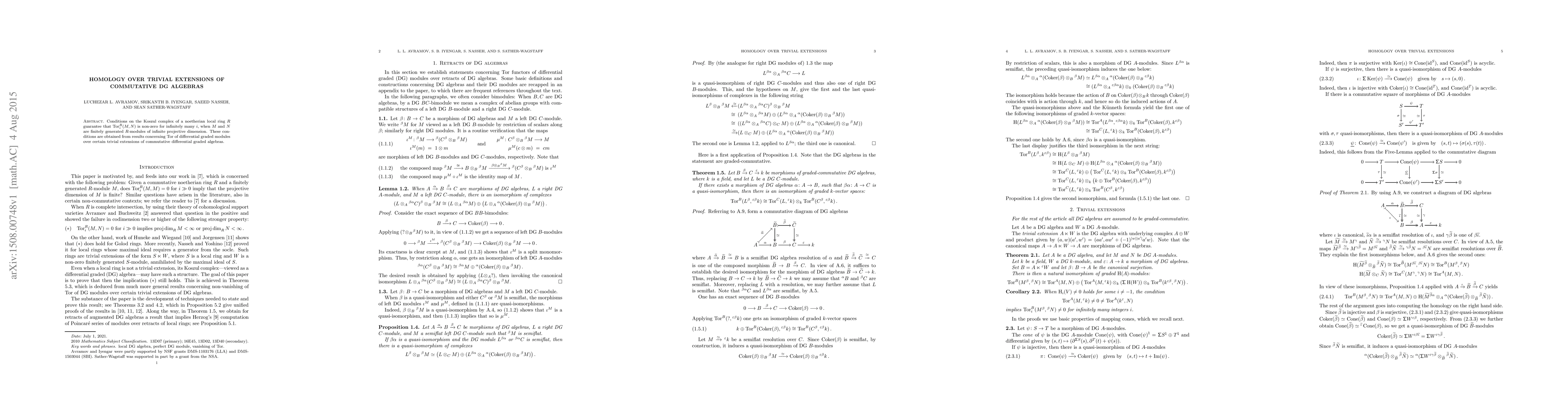 Conditions on the Koszul complex of a noetherian local ring $R$ guarantee that $\mathrm{Tor}^{R}_{i}(M,N)$ is non-zero for infinitely many $i$, when $M$ and $N$ are finitely generated $R$-modules of infinite projective dimension. These conditions are obtained from results concerning Tor of differential graded modules over certain trivial extensions of commutative differential graded algebras.