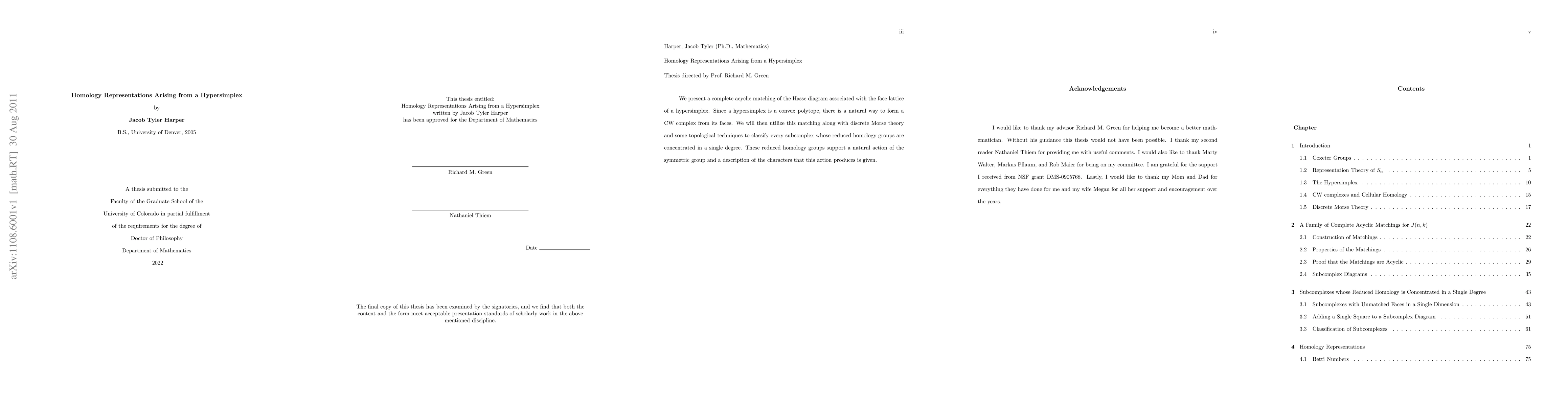 This paper presents a complete acyclic matching of the hypersimplex face lattice's Hasse diagram, employing discrete Morse theory to classify subcomplexes with single-degree homology, and describes the resulting symmetric group actions and their characters.