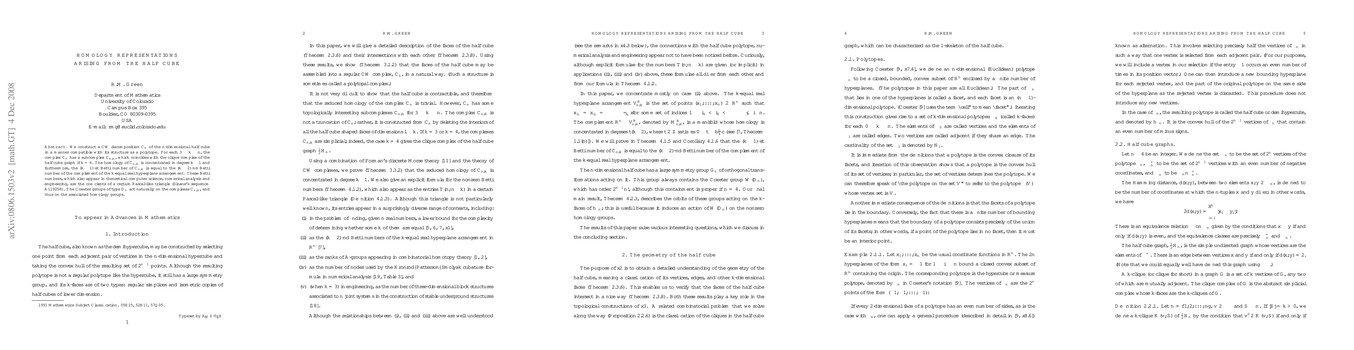 This paper constructs a CW decomposition of the $n$-dimensional half cube that aligns with its polytope structure, revealing homology concentrated in degree $k-1$ for $3 \leq k \leq n$. The Betti numbers of these complexes relate to those of hyperplane arrangements and appear in various fields, while Coxeter groups of type $D_n$ act on these complexes and their associated homology.