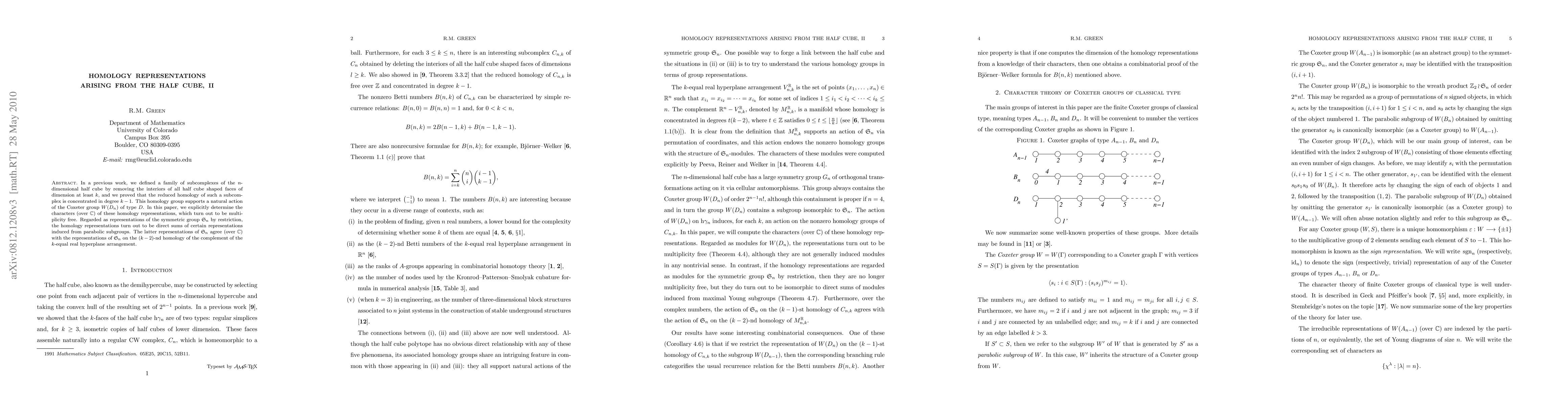 This paper determines the characters of homology representations of subcomplexes of the $n$-dimensional half cube, showing they are multiplicity free and relate to representations of the Coxeter group $W(D_n)$. These representations, when restricted to the symmetric group $S_n$, are direct sums of induced representations from parabolic subgroups, aligning with the representations on the $(k-2)$-nd homology of the $k$-equal real hyperplane arrangement.