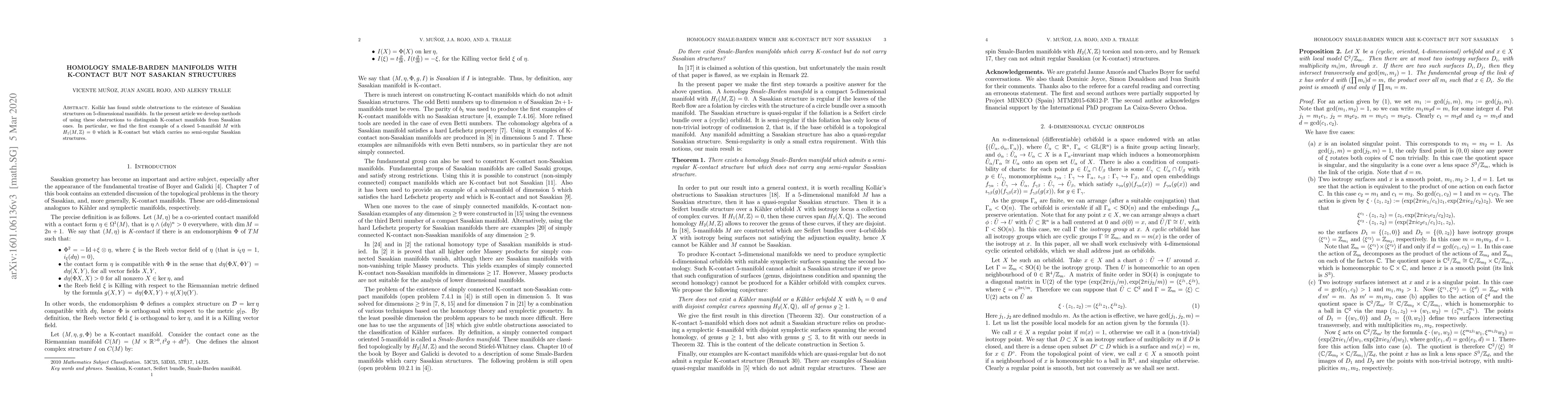 Koll\'ar has found subtle obstructions to the existence of Sasakian structures on 5-dimensional manifolds. In the present article we develop methods of using these obstructions to distinguish K-contact manifolds from Sasakian ones. In particular, we find the first example of a closed 5-manifold M with $H_1(M,Z)=0$ which is K-contact but which carries no semi-regular Sasakian structures.