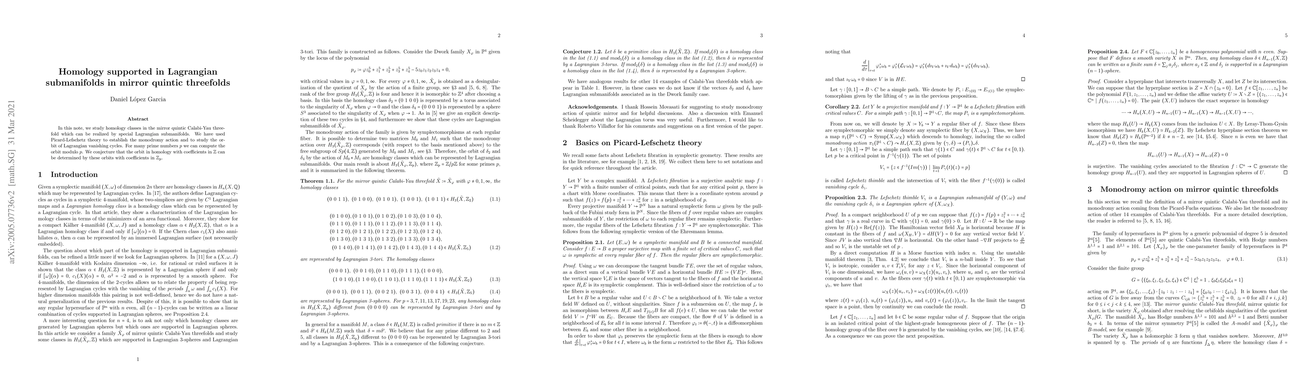 This paper investigates homological cycles in the mirror quintic Calabi-Yau threefold realized by special Lagrangian submanifolds, employing Picard-Lefschetz theory to analyze monodromy actions and Lagrangian vanishing cycles. It proposes that the orbit of these cycles in homology can be inferred from computations modulo prime numbers $p$.