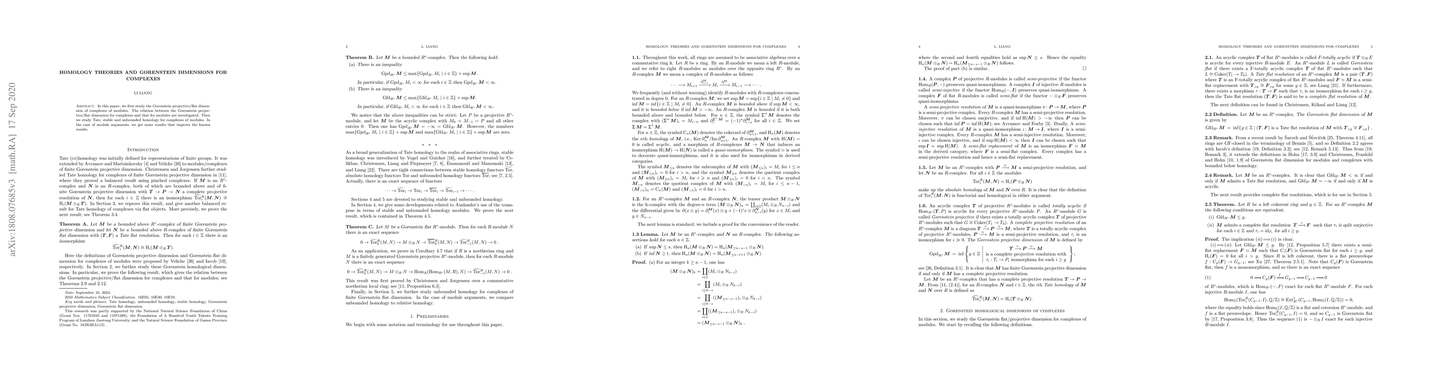 In this paper, we first study the Gorenstein projective/flat dimension of complexes of modules. The relation between the Gorenstein projective/flat dimension for complexes and that for modules are investigated. Then we study Tate, stable and unbounded homology for complexes of modules. In the case of module arguments, we get some results that improve the known results.