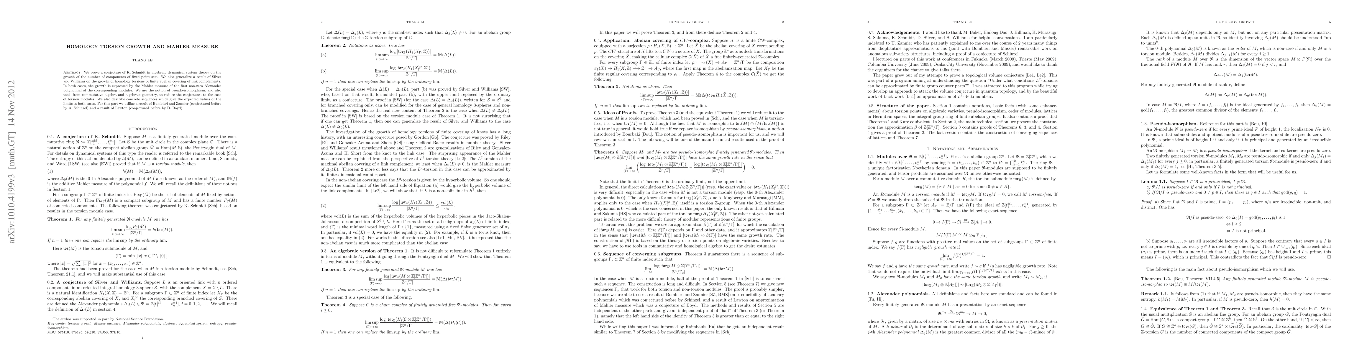 This paper proves K. Schmidt's conjecture on the growth of fixed point set components in algebraic dynamical systems and generalizes a result on homology torsion growth in finite abelian coverings of link complements, both linked to Mahler measure. The study uses pseudo-isomorphism and tools from commutative algebra and algebraic geometry to derive expected limit values.