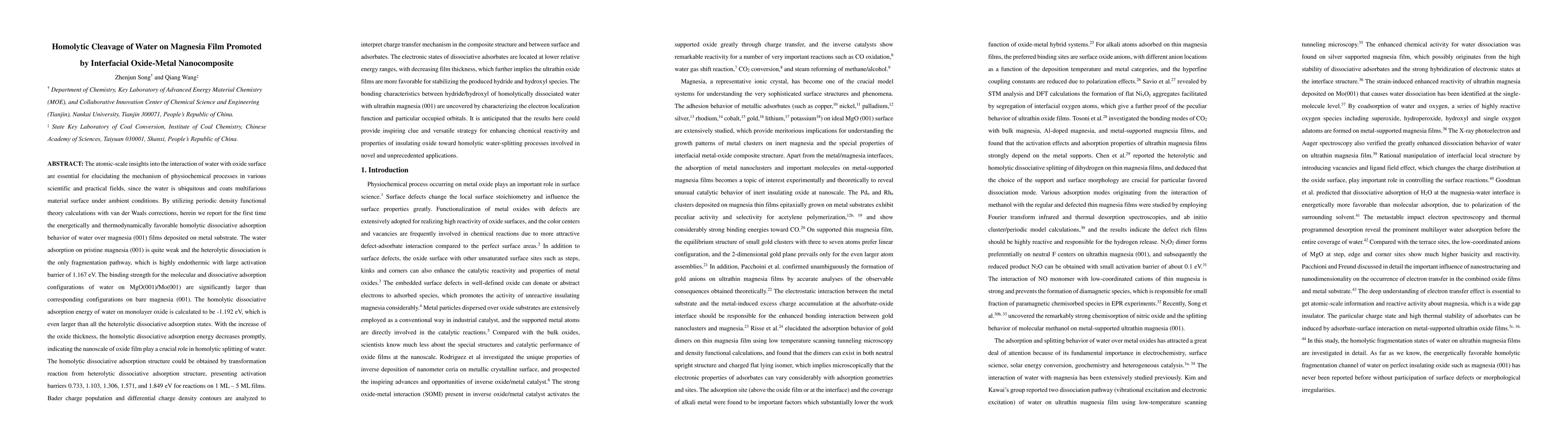 This study reveals that magnesia films on metal substrates promote the energetically favorable homolytic cleavage of water through dissociative adsorption, as opposed to the weak and endothermic heterolytic dissociation on pristine magnesia. The findings suggest a significant enhancement in water splitting efficiency at the nanoscale.