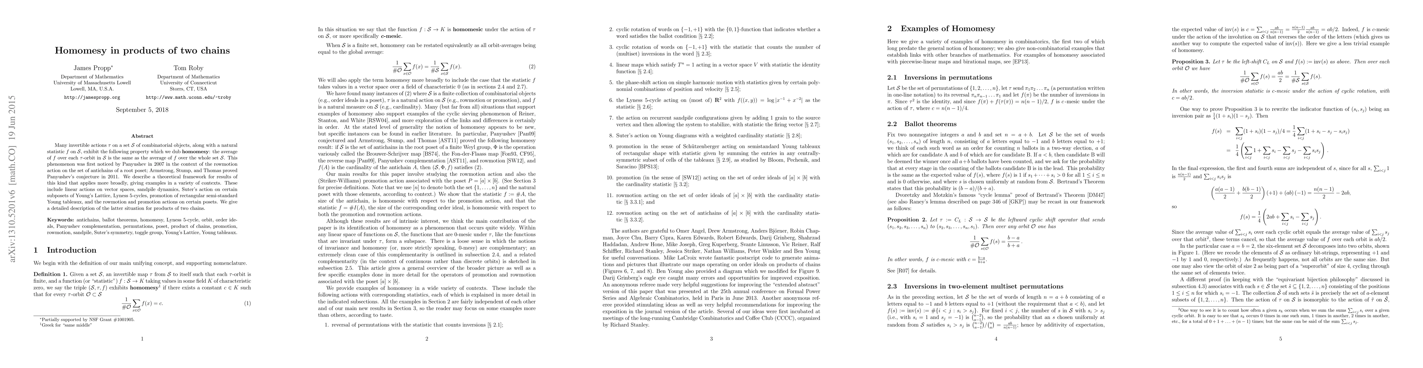 Many invertible actions $\tau$ on a set ${\mathcal{S}}$ of combinatorial objects, along with a natural statistic $f$ on ${\mathcal{S}}$, exhibit the following property which we dub \textbf{homomesy}: the average of $f$ over each $\tau$-orbit in ${\mathcal{S}}$ is the same as the average of $f$ over the whole set ${\mathcal{S}}$. This phenomenon was first noticed by Panyushev in 2007 in the context of the rowmotion action on the set of antichains of a root poset; Armstrong, Stump, and Thomas proved Panyushev's conjecture in 2011. We describe a theoretical framework for results of this kind that applies more broadly, giving examples in a variety of contexts. These include linear actions on vector spaces, sandpile dynamics, Suter's action on certain subposets of Young's Lattice, Lyness 5-cycles, promotion of rectangular semi-standard Young tableaux, and the rowmotion and promotion actions on certain posets. We give a detailed description of the latter situation for products of two chains.