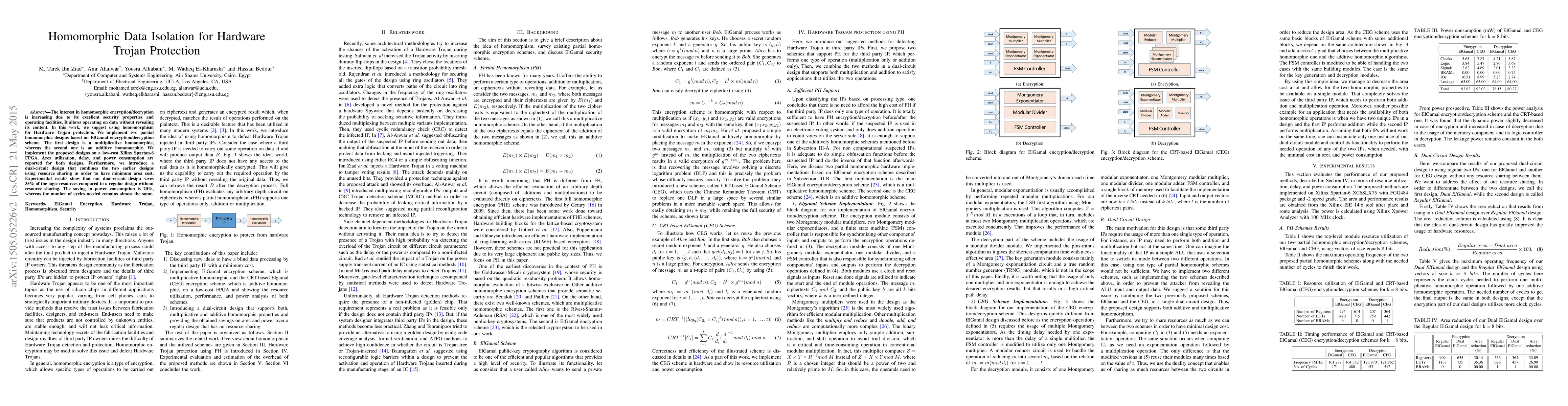 The interest in homomorphic encryption/decryption is increasing due to its excellent security properties and operating facilities. It allows operating on data without revealing its content. In this work, we suggest using homomorphism for Hardware Trojan protection. We implement two partial homomorphic designs based on ElGamal encryption/decryption scheme. The first design is a multiplicative homomorphic, whereas the second one is an additive homomorphic. We implement the proposed designs on a low-cost Xilinx Spartan-6 FPGA. Area utilization, delay, and power consumption are reported for both designs. Furthermore, we introduce a dual-circuit design that combines the two earlier designs using resource sharing in order to have minimum area cost. Experimental results show that our dual-circuit design saves 35% of the logic resources compared to a regular design without resource sharing. The saving in power consumption is 20%, whereas the number of cycles needed remains almost the same