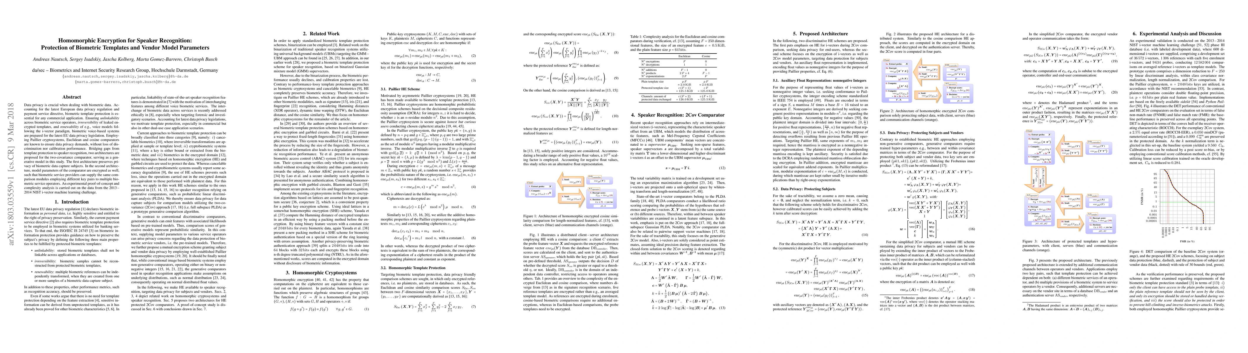 This paper proposes two homomorphic encryption architectures for speaker recognition that protect biometric templates and vendor model parameters, ensuring compliance with EU data privacy regulations. The study employs Paillier cryptosystems to maintain privacy without compromising discrimination or calibration performance, validated through experiments on NIST i-vector challenge data.