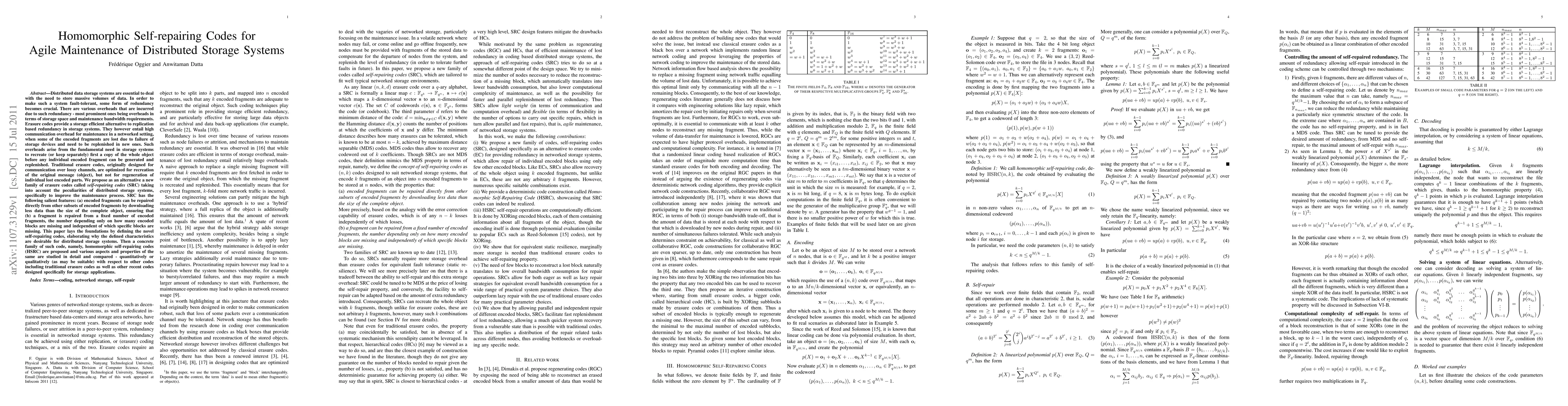 This paper introduces self-repairing codes (SRC) to enhance fault-tolerance in distributed storage systems by reducing maintenance overhead. It proposes homomorphic self-repairing codes (HSRC) that allow repairs with minimal data download, ensuring efficient and agile maintenance.