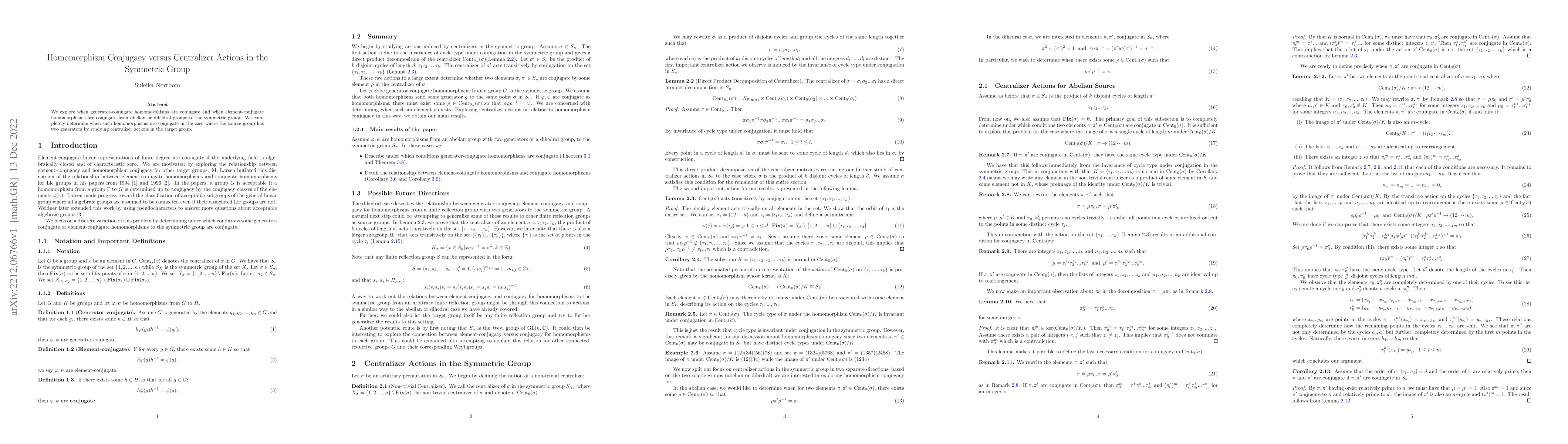 We explore when generator-conjugate homomorphisms are conjugate and when element-conjugate homomorphisms are conjugate from abelian or dihedral groups to the symmetric group. We completely determine when such homomorphisms are conjugate in the case where the source group has two generators by studying centralizer actions in the target group.