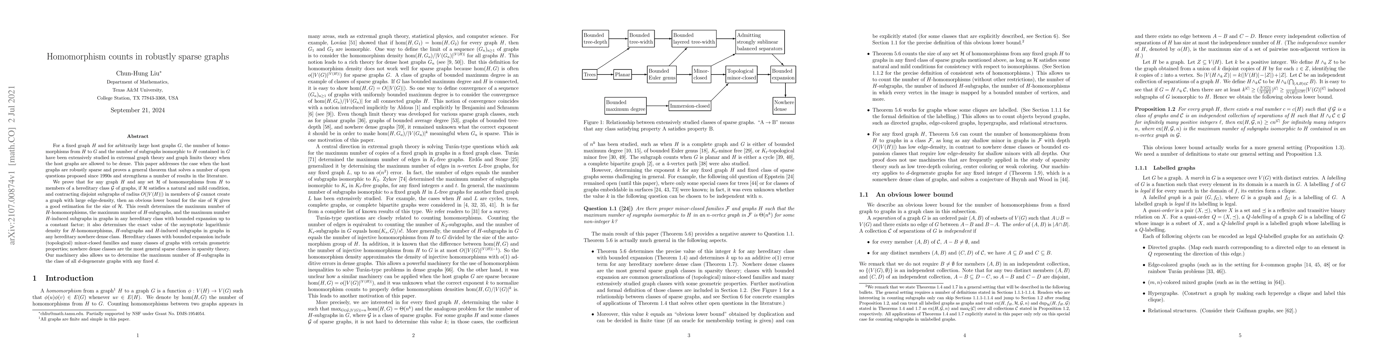 For a fixed graph $H$ and for arbitrarily large host graphs $G$, the number of homomorphisms from $H$ to $G$ and the number of subgraphs isomorphic to $H$ contained in $G$ have been extensively studied in extremal graph theory and graph limits theory when the host graphs are allowed to be dense. This paper addresses the case when the host graphs are robustly sparse and proves a general theorem that solves a number of open questions proposed since 1990s and strengthens a number of results in the literature. We prove that for any graph $H$ and any set ${\mathcal H}$ of homomorphisms from $H$ to members of a hereditary class ${\mathcal G}$ of graphs, if ${\mathcal H}$ satisfies a natural and mild condition, and contracting disjoint subgraphs of radius $O(\lvert V(H) \rvert)$ in members of ${\mathcal G}$ cannot create a graph with large edge-density, then an obvious lower bound for the size of ${\mathcal H}$ gives a good estimation for the size of ${\mathcal H}$. This result determines the maximum number of $H$-homomorphisms, the maximum number of $H$-subgraphs, and the maximum number $H$-induced subgraphs in graphs in any hereditary class with bounded expansion up to a constant factor; it also determines the exact value of the asymptotic logarithmic density for $H$-homomorphisms, $H$-subgraphs and $H$-induced subgraphs in graphs in any hereditary nowhere dense class. Hereditary classes with bounded expansion include (topological) minor-closed families and many classes of graphs with certain geometric properties; nowhere dense classes are the most general sparse classes in sparsity theory. Our machinery also allows us to determine the maximum number of $H$-subgraphs in the class of all $d$-degenerate graphs with any fixed $d$.