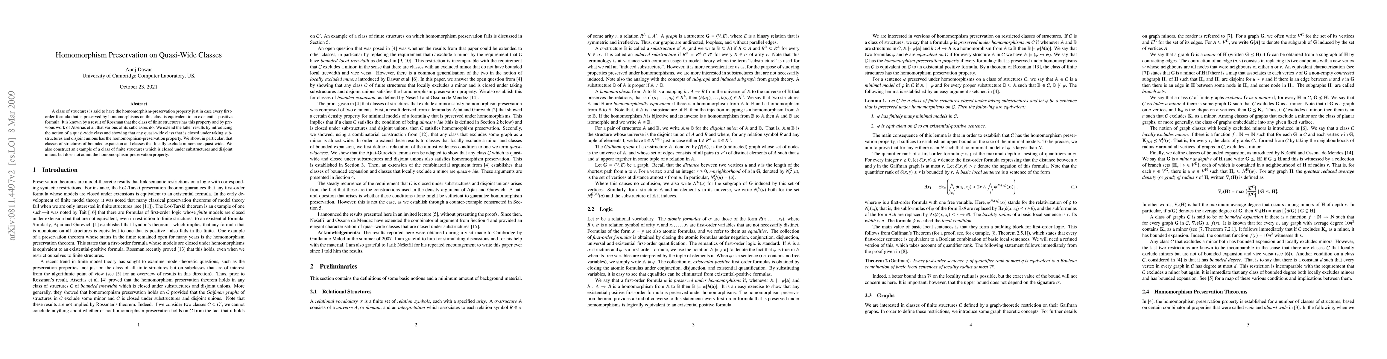 The paper introduces the concept of quasi-wide classes and extends previous results to show that such classes have the homomorphism-preservation property, provided they are closed under substructures and disjoint unions. It also constructs an example of a class that is closed under substructures and disjoint unions but lacks the homomorphism-preservation property.