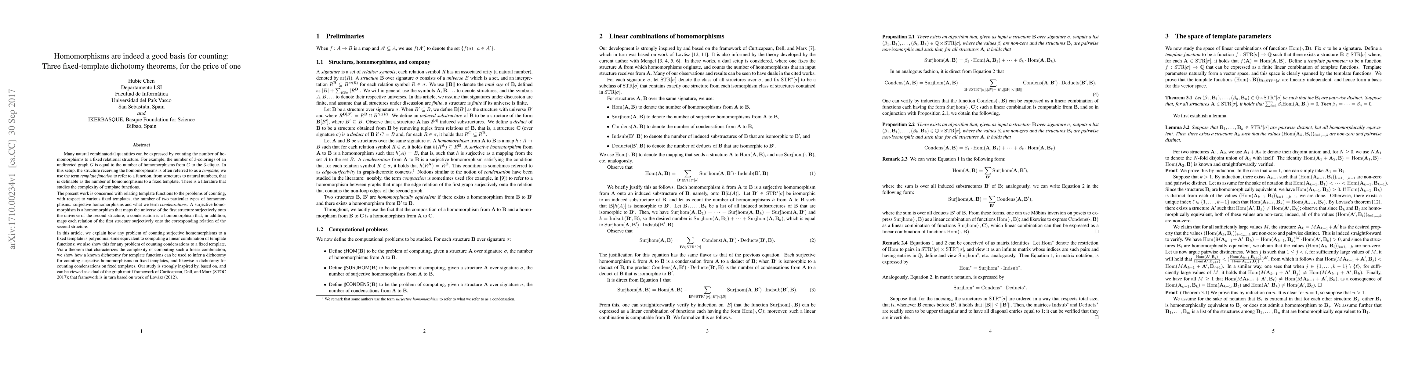 Many natural combinatorial quantities can be expressed by counting the number of homomorphisms to a fixed relational structure. For example, the number of 3-colorings of an undirected graph $G$ is equal to the number of homomorphisms from $G$ to the $3$-clique. In this setup, the structure receiving the homomorphisms is often referred to as a template; we use the term template function to refer to a function, from structures to natural numbers, that is definable as the number of homomorphisms to a fixed template. There is a literature that studies the complexity of template functions. The present work is concerned with relating template functions to the problems of counting, with respect to various fixed templates, the number of two particular types of homomorphisms: surjective homomorphisms and what we term condensations. In this article, we explain how any problem of counting surjective homomorphisms to a fixed template is polynomial-time equivalent to computing a linear combination of template functions; we also show this for any problem of counting condensations to a fixed template. Via a theorem that characterizes the complexity of computing such a linear combination, we show how a known dichotomy for template functions can be used to infer a dichotomy for counting surjective homomorphisms on fixed templates, and likewise a dichotomy for counting condensations on fixed templates. Our study is strongly inspired by, based on, and can be viewed as a dual of the graph motif framework of Curticapean, Dell, and Marx (STOC 2017); that framework is in turn based on work of Lov\'asz (2012).