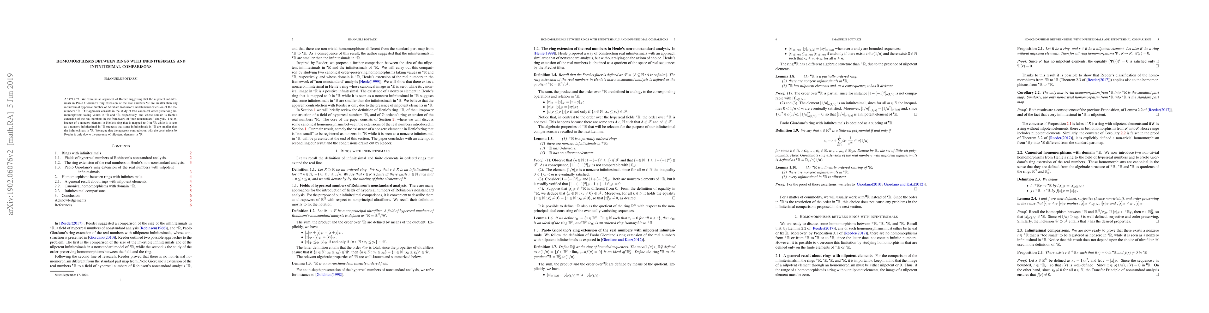 We examine an argument of Reeder suggesting that the nilpotent infinitesimals in Paolo Giordano's ring extension of the real numbers $^{\bullet}\mathbb{R}$ are smaller than any infinitesimal hyperreal number from Abraham Robinson's nonstandard analysis $^\ast\mathbb{R}$. Our approach consists in the study of two canonical order-preserving homomorphisms taking values in ${^{\bullet}\mathbb{R}}$ and in ${^\ast\mathbb{R}}$, respectively, and whose domain is Henle's extension of the real numbers in the framework of "non-nonstandard" analysis. In particular, we will show that there exists a nonzero element in Henle's ring that is "too small" to be registered as nonzero in Paolo Giordano's ring, while it is seen as a nonzero infinitesimal in ${^\ast\mathbb{R}}$. This result suggests that some hyperreal infinitesimals are smaller than the nilpotent infinitesimals. We argue that the apparent contradiction with the conclusions by Reeder is only due to the presence of nilpotent elements in ${^{\bullet}\mathbb{R}}$.