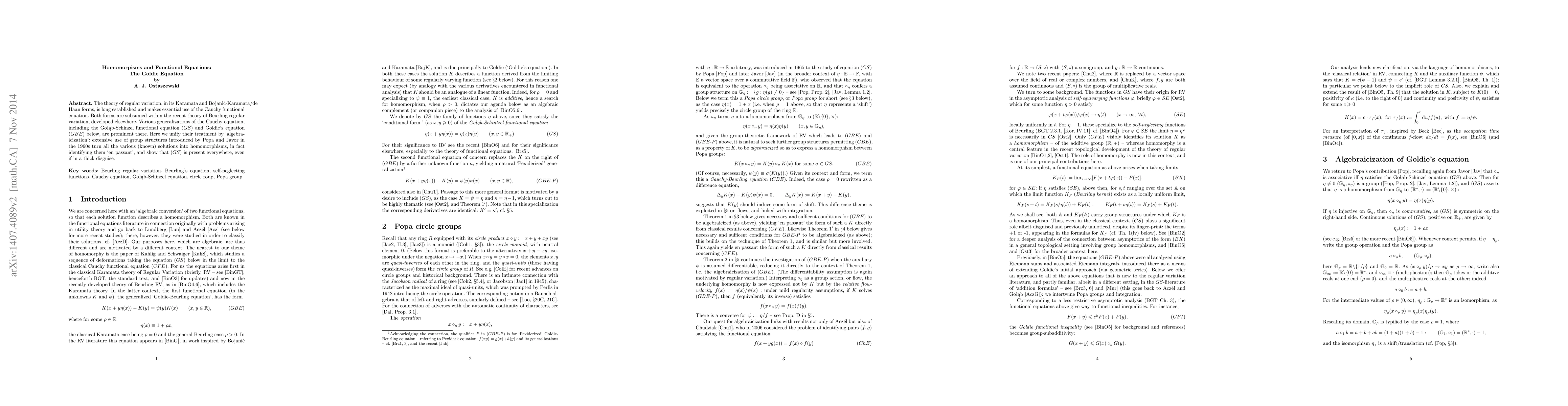 The theory of regular variation, in its Karamata and Bojani\'c-Karamata/de Haan forms, is long established and makes essential use of the Cauchy functional equation. Both forms are subsumed within the recent theory of Beurling regular variation, developed elsewhere. Various generalizations of the Cauchy equation, including the Go{\l}\k{a}b-Schinzel functional equation (GS), are prominent there. Here we unify their treatment by `algebraicization': extensive use of group structures introduced by Popa and Javor in the 1960s turn all the various solutions into homomorphisms, and show that (GS) is present everywhere, even if in a thick disguise.
