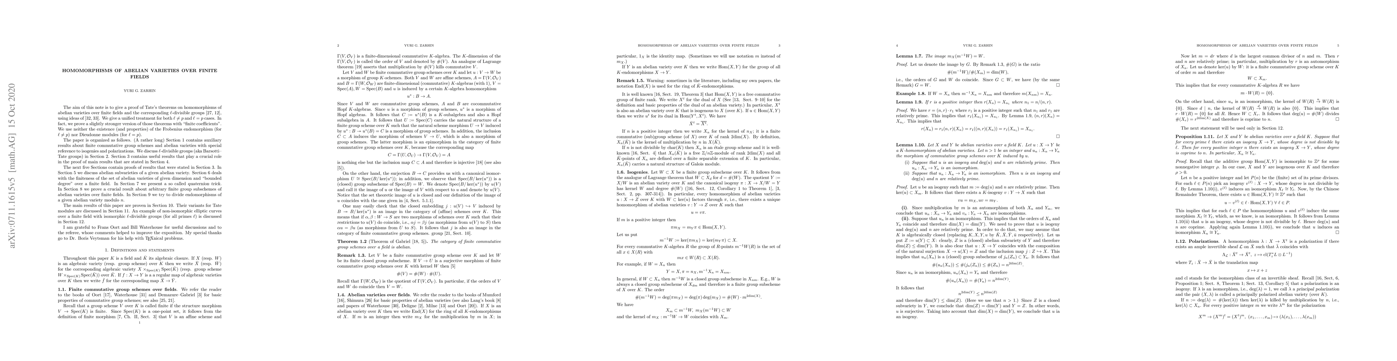 These are notes of my lectures at the summer school "Higher-dimensional geometry over finite fields" in Goettingen, June--July 2007. We present a proof of Tate's theorem on homomorphisms of abelian varieties over finite fields (including the $\ell=p$ case) that is based on a "quaternion trick". In fact, a a slightly stronger version of those theorems with "finite coefficients" is proven.