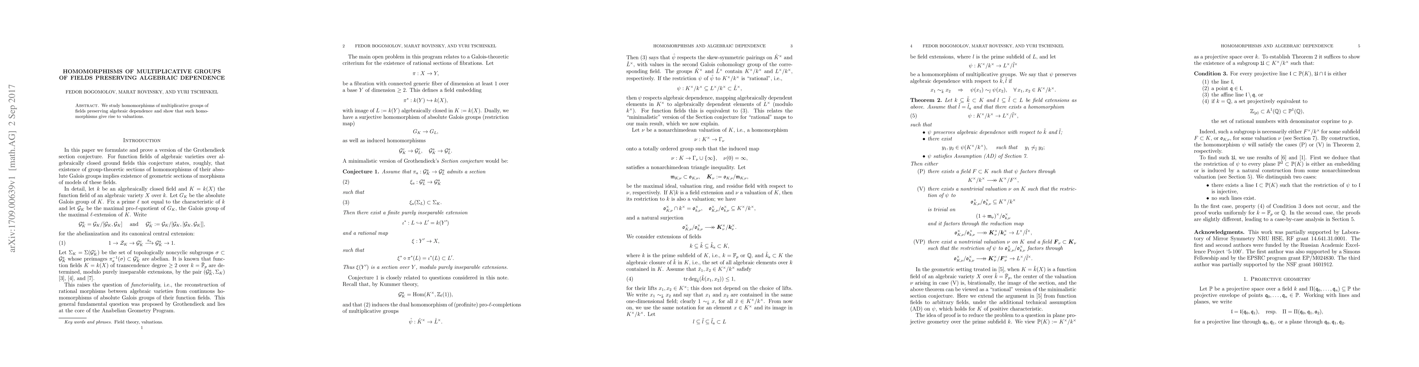 Summary: This paper investigates homomorphisms that maintain algebraic dependence in multiplicative groups of fields, demonstrating that these homomorphisms correspond to valuations.
