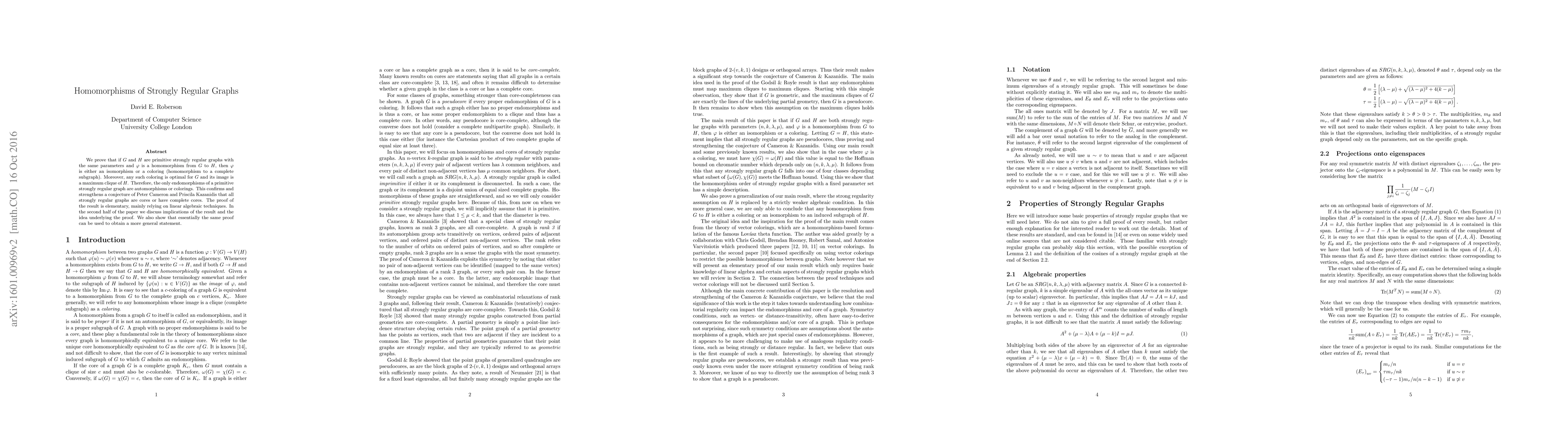 Researchers prove that a homomorphism between two primitive strongly regular graphs with the same parameters is either an isomorphism or a coloring, confirming a conjecture about strongly regular graphs being cores or having complete cores.