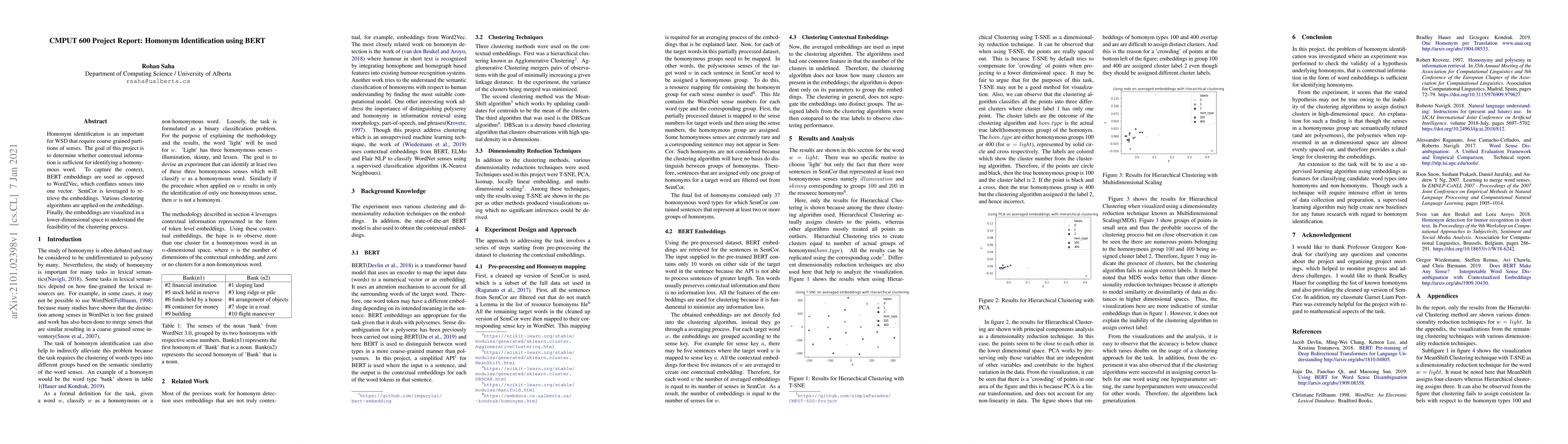 Homonym identification is important for WSD that require coarse-grained partitions of senses. The goal of this project is to determine whether contextual information is sufficient for identifying a homonymous word. To capture the context, BERT embeddings are used as opposed to Word2Vec, which conflates senses into one vector. SemCor is leveraged to retrieve the embeddings. Various clustering algorithms are applied to the embeddings. Finally, the embeddings are visualized in a lower-dimensional space to understand the feasibility of the clustering process.