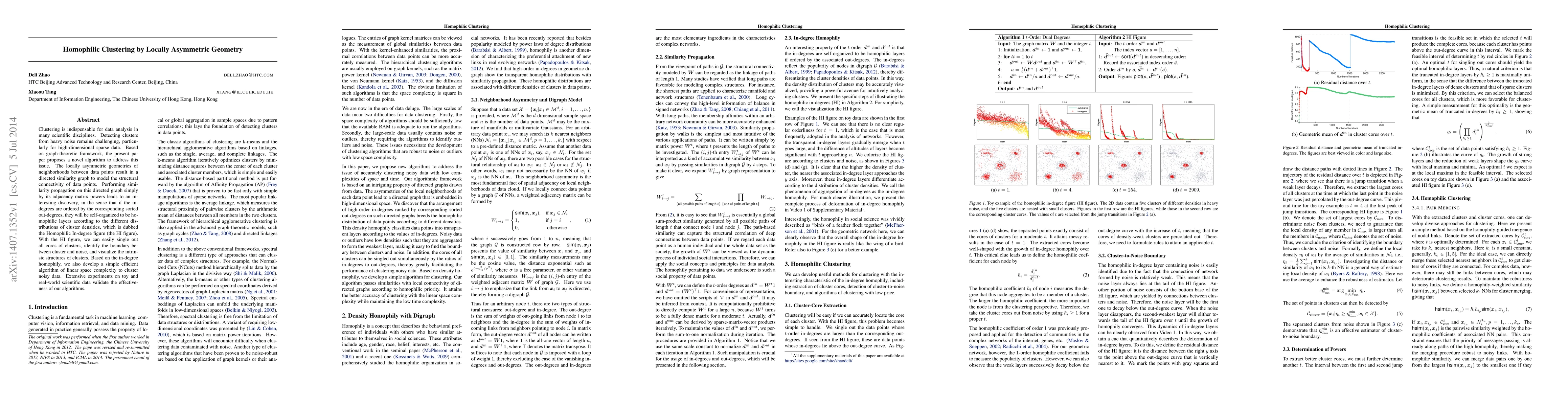 Clustering is indispensable for data analysis in many scientific disciplines. Detecting clusters from heavy noise remains challenging, particularly for high-dimensional sparse data. Based on graph-theoretic framework, the present paper proposes a novel algorithm to address this issue. The locally asymmetric geometries of neighborhoods between data points result in a directed similarity graph to model the structural connectivity of data points. Performing similarity propagation on this directed graph simply by its adjacency matrix powers leads to an interesting discovery, in the sense that if the in-degrees are ordered by the corresponding sorted out-degrees, they will be self-organized to be homophilic layers according to the different distributions of cluster densities, which is dubbed the Homophilic In-degree figure (the HI figure). With the HI figure, we can easily single out all cores of clusters, identify the boundary between cluster and noise, and visualize the intrinsic structures of clusters. Based on the in-degree homophily, we also develop a simple efficient algorithm of linear space complexity to cluster noisy data. Extensive experiments on toy and real-world scientific data validate the effectiveness of our algorithms.
