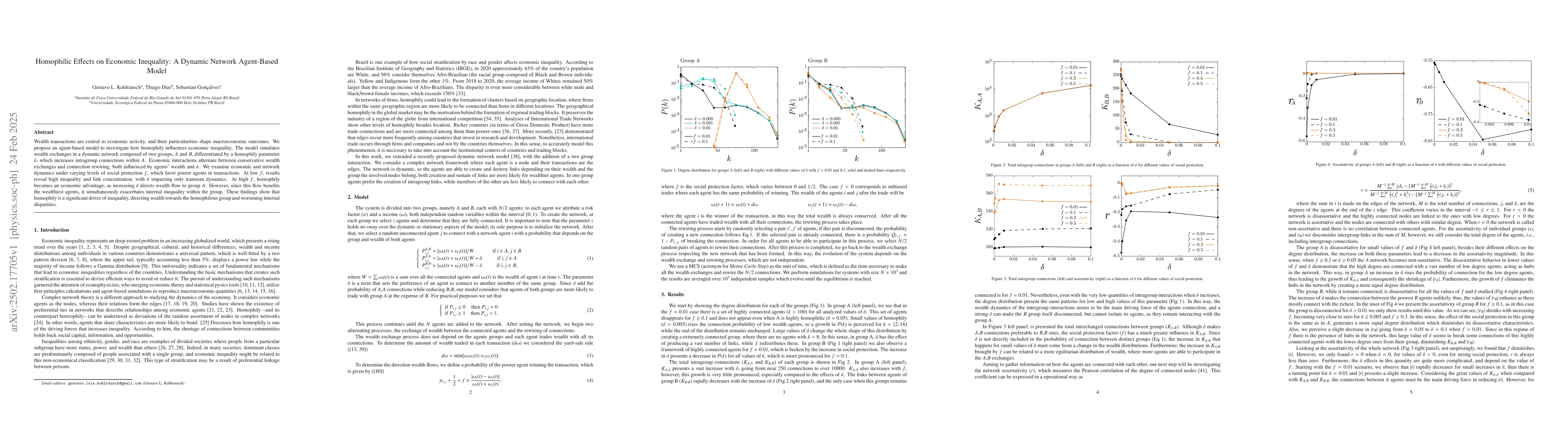 The study employs a dynamic network agent-based model to explore how homophily influences economic inequality, revealing that homophily can direct wealth toward a group, exacerbating internal inequality while benefiting the wealthiest agents. The model's findings highlight the complex interplay between social protection levels and homophily's economic impact.