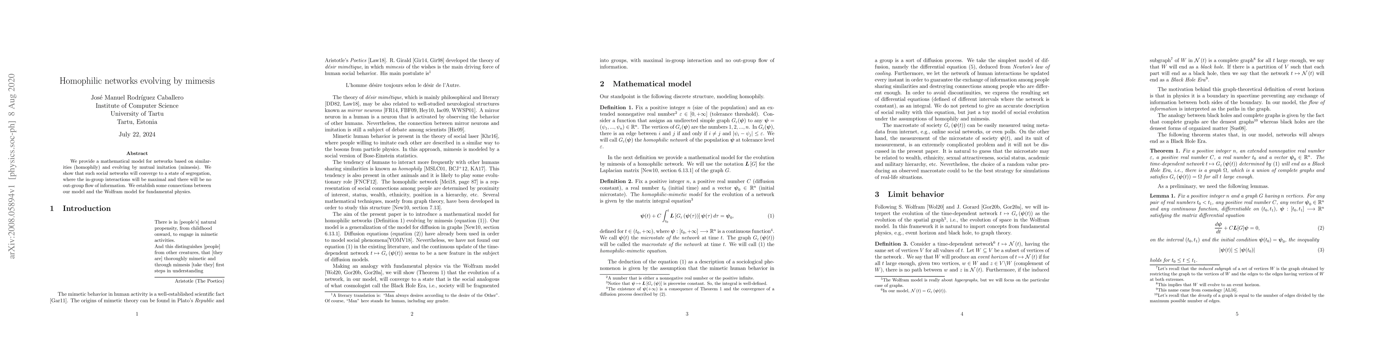 We provide a mathematical model for networks based on similarities (homophily) and evolving by mutual imitation (mimesis). We show that such social networks will converge to a state of segregation, where the in-group interactions will be maximal and there will be no out-group flow of information. We establish some connections between our model and the Wolfram model for fundamental physics.