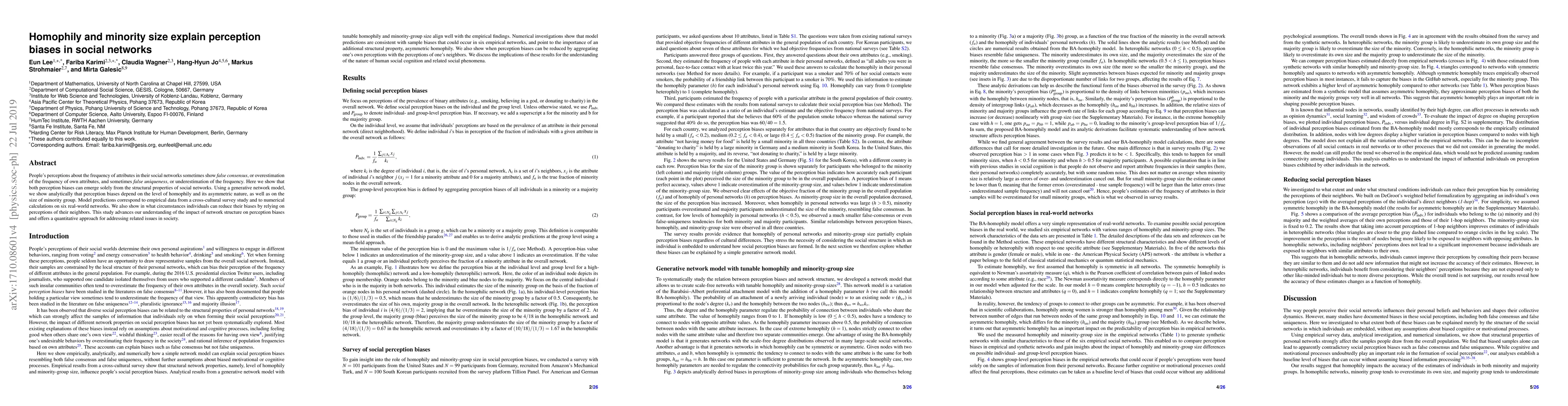 Title: Homophily and minority size explain perception biases in social networks Summary: The study reveals that perception biases regarding minority group sizes in social networks are driven by network structure, specifically homophily levels and minority group size, rather than cognitive or motivational biases. The research uses a generative model to show how these biases emerge and validates the model with empirical data and real-world networks.